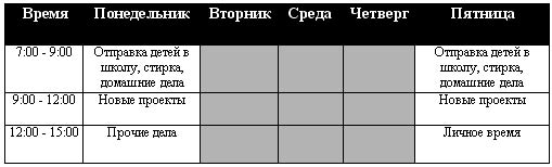 распределения времени по понедельникам и пятницам. Мы решили, что по утрам она будет отвозить детей в школу, возвращаться домой и в течение одного часа готовить еду, заниматься стиркой и убирать дом. По понедельникам и пятницам мы выделили время с девяти часов утра до полудня для ее проектов по переустройству дома. В эти промежутки времени Элли могла заниматься любыми личными проектами и делами.Время с двенадцати до трех часов дня по понедельникам она проводила в разъездах по делам. С двенадцати до трех часов дня по пятницам Элли резервировала время для самой себя. Она могла пообедать с друзьями, почитать книгу или прогуляться — это было ее время. Личное время в пятницу после полудня было ее наградой в конце недели и стимулом для дальнейшей работы.