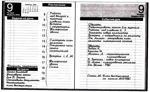 Напротив, программное обеспечение для компьютеров почти всегда дает вам возможность обзора расписания в любых масштабах времени, поэтому вам не придется выбирать. Вам необходимо, однако, убедиться, что выбранная вами программа позволяет вводить в свое расписание частично совпадающие или перекрывающиеся во времени задачи. Например, если с двух до пяти часов дня вы выделили время на подготовку отчета, но хотите запланировать на три часа дня телефонный звонок, позволит ли вам программа ввести в ваше расписание напоминание об этом? Некоторые программы этого не позволяют, что может значительно ограничить удобство работы с ними.