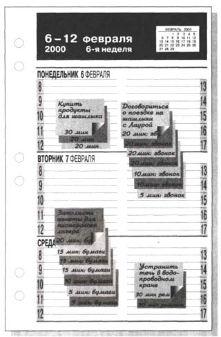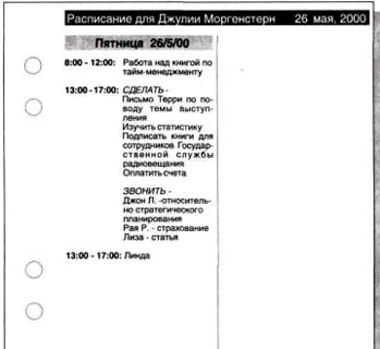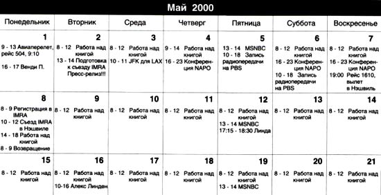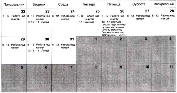Это расписание составлено и распечатано с помощью электронного планировщика PalmPilot. Его программные средства позволили мне ввести в расписание повторяющуюся задачу «Работа над книгой с 8 до 12 часов» одним нажатием клавиши