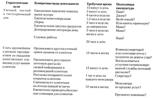 Чтобы конкретно определить, что и кому нужно делегировать, бывает удобно составить план делегирования задач. Возьмите лист бумаги и разделите его на четыре столбца. В первом столбце выпишите свои стратегические цели. Во втором перечислите все те виды деятельности, которые служат достижению этой цели. В третьем столбце оцените время, которое требуется для выполнения каждой задачи. В четвертом отметьте, кто, по вашему мнению, лучше всего подходит для этой работы, учитывая такие факторы, как необходимое для выполнения задачи время, надежность кандидата и его пригодность к выполнению данной задачи. Пример такого плана приведен на следующей странице.