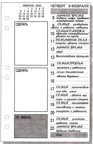 Некоторые люди чувствуют себя скованно, когда пытаются планировать свои дела вплоть до мельчайших подробностей; другие же чувствуют себя более уверенно и не выбиваются из графика, если заранее знают, что они будут делать, с точностью до тридцати минут и планируют свои действия в каждом из тридцатиминутных блоков времени. Ваши зоны деятельности могут быть подобраны и установлены индивидуально, как и ваш шкаф для одежды. Некоторым людям удобно отдельно складывать каждую пару носков, отделяя их друг от друга специальными перегородками; других вполне устраивает то, что они просто знают, что все их носки лежат в одном месте. Помните, ваш план распределения времени составлен с учетом вашего стиля и ваших особенностей и предпочтений.