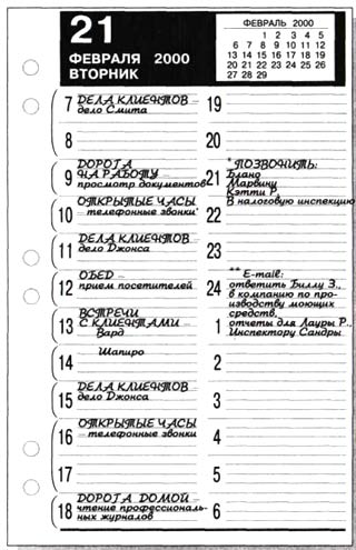 График работы адвоката. Заметьте, что список звонков, которые нужно сделать, и писем, которые надо написать и отправить в этот день, помещен в правой колонке; эти задачи будут выполняться во время одного из двух промежутков времени, отведенных для звонков и обработки корреспонденции