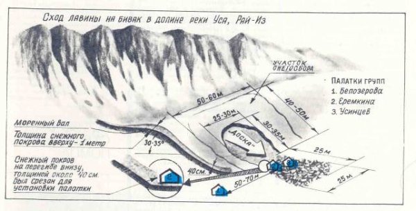 когда они устанавливали палатку под мореной и подрезали нижний край снежного покрова.С аварией группы Дятлова здесь тоже прослеживается аналогия: палатки и там, и там были установлены в месте нечеткого перегиба склона, - там, где крутизна склона вверх увеличивается (до 30 градусов над палатками Еремкина и усинцев, и до 23 градусов над палаткой Дятлова на Холатчахле). Такие перегибы опасны, - в них снежные пласты напряжены, их подрезка вызывает перенапряжения вышележащих пластов снега. А небольшая крутизна склона вниз создает иллюзию, что склон «некрутой», хотя для лавины со склона выше палатки «важна» не крутизна вниз, а крутизна вверх. Именно она, эта крутизна вверх, определяет лавиноопасность склона. Склон в случае аварии на Рай-Из был круче, потому и лавина сразу привела к тяжелой катастрофе: 13 человек были раздавлены почти мгновенно. Сам Еремкин в палатке услышал крик: «Лавина!», почувствовал, как сначала сдавило ноги, потом тело сдавило целиком, а дальше он потерял сознание. Лавина имела характер небольшого оползня по склону, - на таком маленьком расстоянии она не успела хорошо разогнаться и пройти далеко. Но и ее квазистатического (медленно нарастающего) усилия вполне хватало, чтобы запросто раздавить и засыпать две палатки с туристами. А лыжи, воткнутые в пяти метрах от палатки, так и остались стоять, - лавина их не тронула.