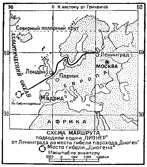 Поймав с гибнущего «Диогена» радиосигнал о бедствии, подлодка явилась к месту катастрофы одновременно с остальными спешившими туда судами, хотя ее отделяло от «Диогена» расстояние, в несколько раз большее. Держась на глубине около двухсот метров, следя за всеми радиопереговорами «Диогена» и его спасителей, подлодка проводила затем тонувшее судно до глубины одного километра и видела, как скопившийся во многих его отсеках воздух под давлением воды в сто атмосфер разорвал судно на несколько частей, которые затем стремительно пошли ко дну.