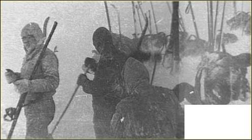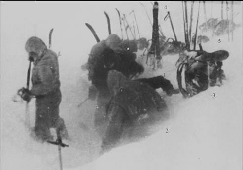 Из найденных фотоаппаратов дятловцев извлекли и проявили пленки, — на них обнаружили и эти фото, сделанные последними. На первом снимке нами цифрами отмечены наиболее важные детали, на которые обратили внимание при тщательном рассмотрении фотографий. Ниже по ходу изложения станет ясно, почему эти обстоятельства имеют большое значение. Состояние снежного покрова, рельеф склона, особенности установки палатки на склоне и метеоусловия в ночь аварии явились главными факторами критической, а затем и аварийной ситуации на горе Холатчахль.
