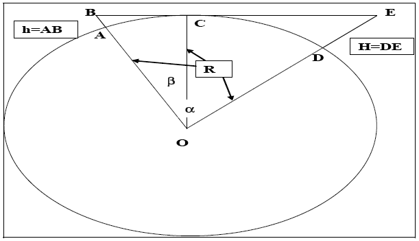 шары» – это ракеты с космодромов! И еще надо проверить высоту полета ракеты. На какую высоту должна подняться ракета, чтобы быть видимой из района Северного Урала? Расчет высоты оказался несложным. Вначале он дал значение около 250 км, но позже цифру немного уточнил, – с учетом высоты наблюдателя в горах она снижалась до 210 км.Расчёт зависимости высоты подъёма ракеты от удалённости наблюдателя по дуге L— дуге AD при h – высота наблюдателя, H – высота ракеты, видимой с расстояния L: