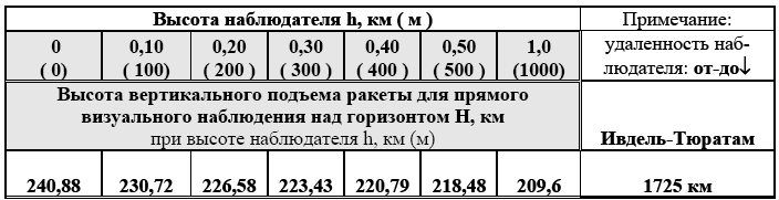 Стали понятны и дополнительные детали наблюдения свидетелей. Пуск по баллистической траектории уводит межконтинентальную ракету значительно выше, чем пуск на низкую орбиту искусственного спутника Земли, причем вывод на большую высоту около 450–480 км происходит уже на активном участке траектории. При высоте подъема 1000 км боевые пуски ракет с Тюратама видны на удалении в несколько тысяч километров и достаточно высоко над горизонтом, – под углом до 30°. Особенно хорошо «звезда» ракеты с ореолом инверсионно-газового следа видна в ясную безлунную ночь с возвышенного места, – оттуда, где видимый горизонт не заслонен близко расположенными объектами. В горах этот световой эффект «летящей в небе кометы» усилен из-за чистоты воздуха и высокого положения наблюдателя. В городах эти наблюдения затруднены и из-за ограничения видимого горизонта строениями и из-за задымленности воздуха.