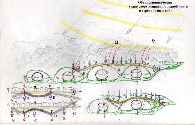 Лавина-«доска» сорвалась на некрутом склоне по слою глубинной изморози после ночного похолодания. Трещина прошла вдоль края обрыва на 20–30 м, после чего пошла вверх и обрушился огромный кусок снежного склона размером более футбольного поля (его верхняя граница частично уходит за пределы снимка). Здесь также много сходного аварией Дятлова: лавина на некрутом склоне, отсутствие опоры снежного пласта снизу, травмы и т. п. Край «доски» увлек в трещину двух туристов, которые погибли от травм. http :// www . mountain . ru / world _ mounts / tien - shan /2000/ nagel / nagel . shtml– гибель Олега Мосейчука (32 года, к.м.с. по альпинизму) и Саши Чеверда (24 года, 1 разряд по альпинизму), Новосибирск, на Ц.Тянь-Шане, район ледника Иныльчек.