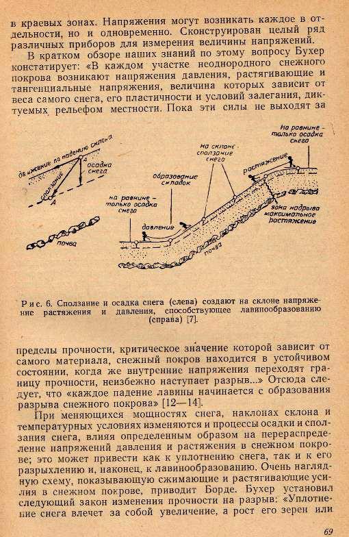 Пример ряда тяжелых аварий показывает, что при общей небольшой лавинной опасности подрезка пласта снега МНОГОКРАТНО увеличила опасность схода пластовой лавины (см. следующую главу об авариях-аналогах). Этот фактор особенно критичен в местах напряжения «снежной доски», как указано, например, в книге Фляйга на стр. 69 (М, «ИИЛ», см также книгу П.И.Лукоянова «Зимние спортивные походы», М., Фис, 1979, с.114): со следующей иллюстрацией и комментариями: