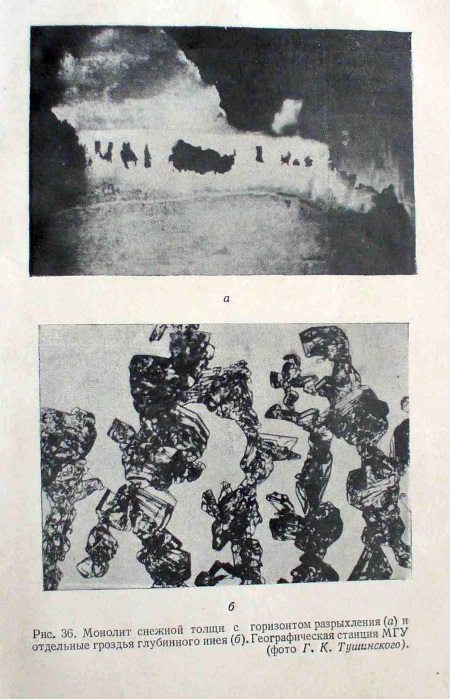 Фото вкладки из книги Малеинова и Тушинского «Путешествие в горах» (между стр. 98–99): вверху (а) под плотным слоем видна слабая подложка горизонта разрыхления с пустотами, а внизу (б) – неплотные гроздья глубинной изморози с необычайно хрупкими, тонкими и непрочными связями между частицами. Внизу приведено фото с увеличением такой хрупкой микроструктуры глубинной изморози