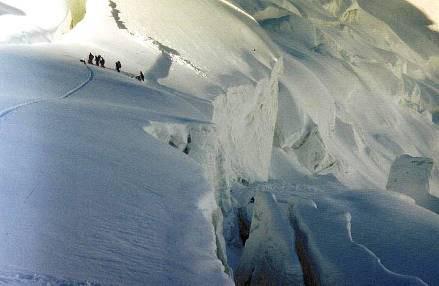 На приведенном ниже фото видны результаты схода «снежной доски» в горах Тянь-Шаня на склоне небольшой крутизны до 15o. Здесь тоже «снежная доска» не была поддержана снизу на краю ледосброса. Она оторвалась на участке длиной около 20 м вдоль края ледосброса, затем трещина пошла вверх и вызвала откол со сходом участка площадью более половины «футбольного поля» (его ближняя и часть дальней границы откола видны на фото). При подрезке снежной доски внизу обрыв лавины может происходить и на склонах с крутизной менее 15°, как в данном случае.