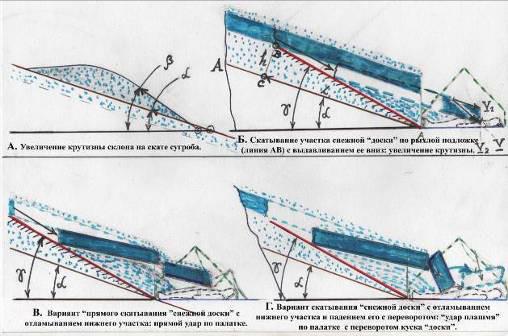 Увеличение крутизны склона за счет надува сугроба (А) и механизмы скатывания (Б) и разрушения (В, Г) «снежной доски» по слою подложки с увеличенной крутизной