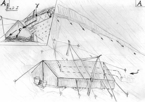 На рисунке Г показано состояние палатки в момент ее обнаружения поисковиками Слобцовым и Шаравиным: из-под снега торчит только угол над верхней стойкой палатки, остатки лавинного выноса занесло снегом и сровняло ветром за 25 суток. Задняя, смятая часть палатки закрыта снегом. В зоне разрыхления (ЗР) в средней части палатки торчали отдельные фрагменты ткани (свидетельство Слобцова): в этой зоне разрыхленный снег (пунктир) сдуло ветром, поэтому фрагменты палатки обнажились из-под снега. Их сильно трепало ветром, поэтому они имели рваные, разлохмаченные края. После аварии палатку занесло снегом, поэтому она сохранилась в разрушенном состоянии. Но ее не разорвало ветром в клочья, как бы случилось, если бы ее не закрывал снег обвала лавины.