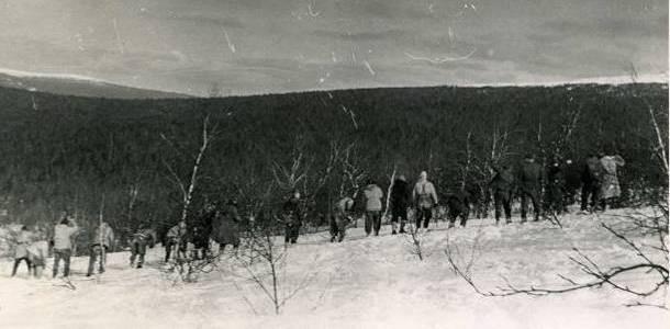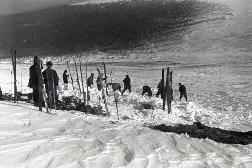 Зондирование снега у кромки леса. На фото видны гора Холатчахль, ее северный отрог, плотный снег под ногами и нечёткое овальное пятно на склоне чуть выше группы спасателей справа – место раскопа палатки