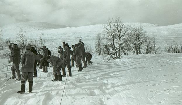 Зондирование снега шеренгой спасателей в зоне редкого леса