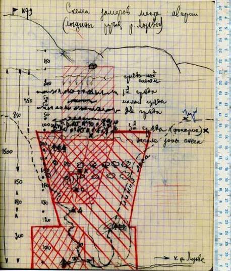 Вне палатки нашли 2 фонаря, – один лежал сверху на палатке, причем под ним был слой снега. Когда поднявший его Слобцов включил, он зажегся. Второй фонарь нашли позже на каменной гряде ниже палатки, – его положение указано Масленниковым на схеме зондирования этого склона. Там же видно положение палатки, кедра, погибших (Д-Дятлов, С-Слободин, К-Колмогорова), границы каменных гряд и леса (три ели и кривым пунктиром – граница высокоствольного леса), положение мансийского чума и отмечены расстояния между основными ориентирами: