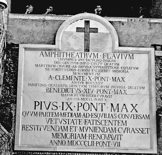Рис. 12. Большая мраморная доска с крестом, висящая над входом в Колизей, торжественно сообщает, что «восстановление» Колизея («АМФИТЕАТРА ФЛАВИЕВ», AMPHITEATRVM FLAVIVM) закончено при папе Пие IX в 1852 году, на 7 году его правления. Фотография 2009 года