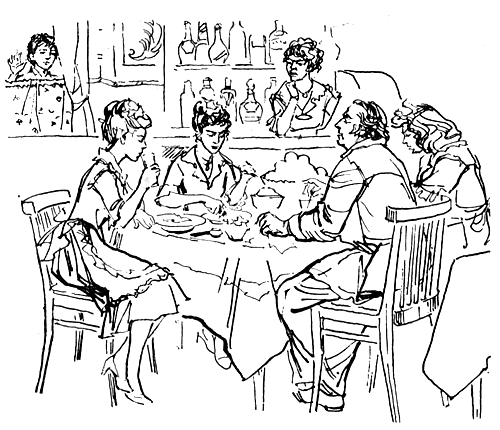Вот лицом к Жан-Марку в светло-зеленом форменном платье и белом фартуке сидит толстуха Мари-Роз, старшая официантка, она нарочно ест не торопясь, чтобы позлить хозяйку. Рядом с ней — такой же толстый шеф-повар, замотанный в несколько передников, но без колпака — он надевает его, только стоя у плиты. Напротив них, спиной к окну, Катрин и еще одна официантка, Жюльен, тоже в зеленых платьях с фартуками, обе сидят как на иголках. Речи Гиены всегда действуют им на нервы, и у них кусок застревает в горле. Последний за служебным столиком — помощник повара Альбер, тощий, с длинной худой шеей. Все молча орудуют вилками и ножами, не догадываясь, что снаружи за ними кто-то наблюдает.