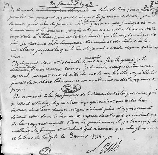«Четыре пятнадцать утра… Сестра, меня приговорили к смерти. Но смерть позорна только для преступников. А меня они приговорили к свиданию с Вашим братом… Я надеюсь умереть с таким же присутствием духа, как и он… Я прошу моего сына никогда не забывать последних слов своего отца. Вот эти слова: «Мой сын, ты никогда не будешь стараться отомстить за мою смерть». Напоминайте их ему чаще, дорогая».