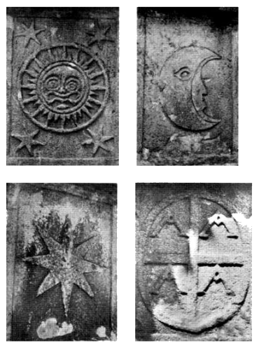 Колонна представляет собой объединяющий образ, связующий воедино символическое содержание знаков на кресте и цоколе, четыре символа на панелях цоколя следует рассматривать как единое целое, своего рода систему, в рамках которой порядок и смысл отдельных символических компонентов могут меняться, но их природа в целом остается постоянной. Другими словами, способ прочтения смысла элементов может быть разным, но сам их смысл, как мы вскоре убедимся, остается неизменным независимо от того, в каком порядке интерпретируются символы на плитах цоколя. Как показано на ил. 11.4, символы на цоколе, если начать с символа на восточной стороне и двигаться против часовой стрелки, включают в себя восьмилучевую звезду и странной формы полулуну-полуладью с широко раскрытым глазом. Затем следует плита с сердитым солнечным ликом, выпученными спиралевидными глазами, широко растянутым ртом и выступающим подбородком. Внутри двух окружностей, расположенных вокруг солнечного лика, находятся шестнадцать больших и шестнадцать малых лучей. Весь этот солнечный круг окружен четырьмя звездами, размещенными по углами прямоугольной плиты и сориентированными таким образом, чтобы диагонали, идущие от их обращенных к солнцу лучей, пересекались в самом центре солнечного лика. Последний символ представляет собой овал, заполняющий все пространство плиты. Внутри него расположен крест, в углах между перекладинами которого расположены четыре буквы А.Перемычка внутри буквы Аимеет необычную форму: вместо горизонтальной перекладины она имеет вид острого угла, обращенного вершиной вниз.