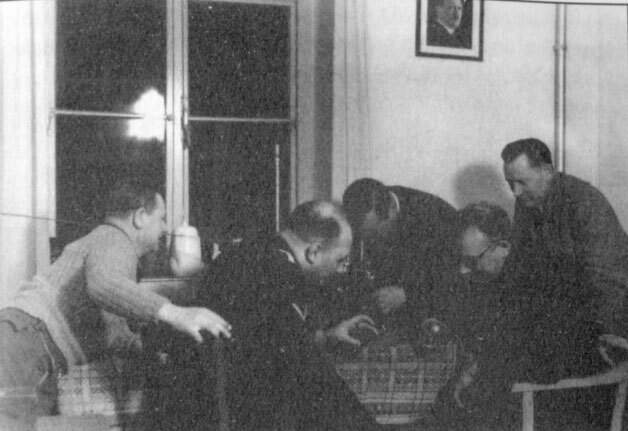 На экспериментальной станции Дахау (слава направо): Франц Лойбл, Антон Лойбл (в униформе), Бруно Гальке (у микроскопа), Карл Малхуз (сидит), Карл Блюм (стоит)