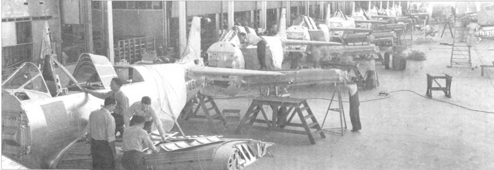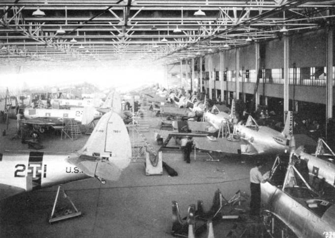 Сборочная линия TBD-1 в Сайта Монике в январе 1938 года. Четырнадцать TBD-1 на различных этапах сборки. На самолёты сразу на заводе наносились цифровые и буквенные коды. Машина слева на переднем плане предназначена для VT-2 авианосца «Лексинтон».