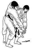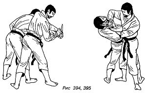 Атакующий проводит комбинационные технические действия ножом, предложенные в уроке 68. Защищающийся делает шаг левой ногой вперед, одновременно захватывает правой рукой одноименное запястье партнера, опускает его атакующую руку вниз, оплетает изнутри своей левой рукой и захватывает своей правой запястье сверху. Затем защищающийся поворачивается лицом к партнеру, одновременно поднимает его захваченную руку вверх, скручивает ее наружу, зашагивает за его спину правой ногой, опрокидывает через нее партнера на спину и обезоруживает (рис. 394, 395).