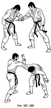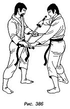 Защищающийся, контратакуя, наносит боковой колющий удар кинжалом в среднюю часть туловища атакующего. Атакующий делает шаг вперед левой ногой с поворотом туловища вправо, разворачивает свой меч острым концом вниз и подставляет его под запястье левой руки партнера, затем проводит своим кинжалом повторную атаку рубящим ударом по правой руке и колющим ударом в грудь защищающегося (рис. 386).