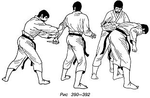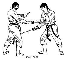 Защищающийся, контратакуя, наносит колющий удар своим мечом в нижнюю часть туловища атакующего. Атакующий кинжалом проводит средний блок изнутри в меч партнера и выполняет повторную атаку рубящим ударом своего меча в левое бедро защищающегося (рис. 389).