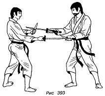 Защищающийся, контратакуя, наносит колющий удар своим мечом в грудь атакующего. Атакующий разворачивает вверх острый край своего кинжала и проводит им средний блок изнутри в меч партнера. Затем удар мечом по левой руке защищающегося, поднимает правую руку локтем вверх и проводит своим мечом колющий удар в лицо защищающегося (рис. 393).