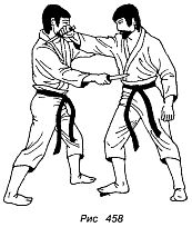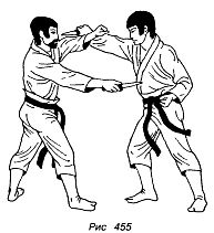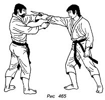 боковой блок левым предплечьем в предплечье атакующей руки партнера, обозначает по нему колющий удар ножом снизу вверх (рис. 465).Выполнить 20 раз и поменяться ролями.