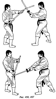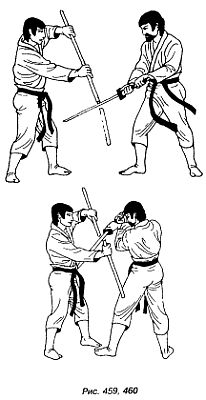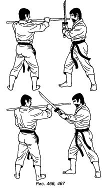Оба партнера стоят друг против друга. Атакующий поднимает длинную палку на уровень головы и проводит ею колющий удар в голову защищающегося. Защищающийся отводит меч к своему правому плечу, протаскивая и отводя внутрь атакующий конец длинной палки партнера, затем делает шаг вперед правой ногой и контратакует, имитируя рубящий удар по пальцам атакующего (рис. 466, 467).