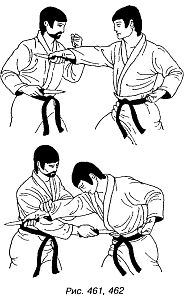 Оба партнера стоят друг против друга. Атакующий правой рукой проводит колющий прямой удар ножом в грудь защищающегося. Защищающийся проводит левым предплечьем средний блок снаружи в предплечье атакующей руки партнера и контратакует его, имитируя колющий удар в туловище (рис. 461, 462).