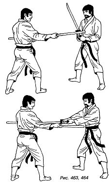 Оба партнера стоят друг против друга. Атакующий длинной палкой проводит колющий удар в нижнюю часть туловища защищающегося. Защищающийся делает шаг вперед-в сторону правой ногой, отводит плоскостью меча атакующий конец длинной палки партнера наружу и наносит по нему рубящий удар мечом сверху вниз, затем проводит имитацию удара мечом по рукам атакующего (рис. 463, 464).