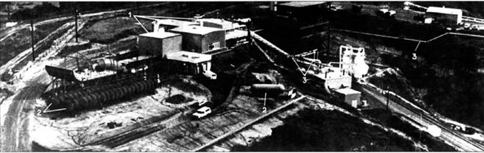 Основные сооружения лазерного полигона Сан-Хуан Капистрано: 1 — технические здания для размещения экспериментальной лазерной системы оружия. 2 — газгольдеры для компонентов лазерного вещества; 3 — трубопроводы. 4 — ограждение испытательной площадки полигона