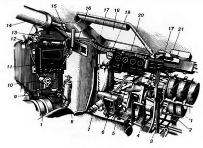 1 — укладка пулеметных магазинов; 2 — педаль подачи топлива; 3 — кулиса переключения передач; 4 — педаль тормозов; 5 — ручной воздушный насос; 6 — педаль главного фрикциона; 7-сиденье механика-водителя; 8-шприц- пресс; 9-воздухораспределительный кран; 10 — кнопка включения маслозакачивающего насоса; 11 — щиток электроприборов; 12 — кран-редуктор воздухопуска; 13 — кнопка включения стартера, 14 — уравновешивающий механизм крышки-люка механика-водителя; 15-спидометр; 16-тахометр, 17 — рычаги управления; 18 — люк механика-водителя; 19 — счетчик моточасов; 20 — щиток контрольно-измерительных приборов; 21 — аппарат № 3 ТПУ механика-водителя