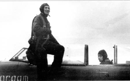 Новые изделия потребовали освоения техники пилотирования: Р.Е. Алексеев за штурвалом учебного самолета Як-18 (в задней кабине).
