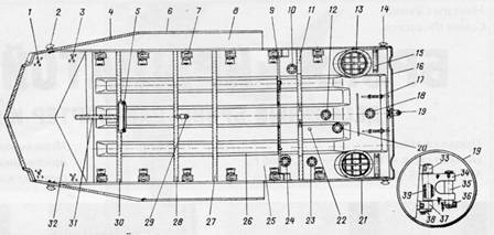 1 — отверстия для крепления кронштейна гидроцилиндра механизма натяжения гусениц; 2 и 14 буксирные крюки; 3 — отверстие для крепления кронштейна передней пневморессоры; 4 и 6 — верхние вертикальные листы; 5 и 29 — пиллерсы; 7 — кронштейны балансиров опорных катков; 8 надгусеничная полкакорпуса; 9 — перегородка; /0 — лючокдля слива топлива из баков; 11, 15,27, 28 и 30 — поперечные балки жесткости корпуса; 12 — лючок для слива масла из двигателя; 13 — заборный патрубок водометного движителя; 16 — кормовой лист; 17 — бугель для крепления силового блока; 18 — лючок для слива масла из коробки передач; 19 — тягово-сцепное устройство; 20 — лючок для доступа к редукционному клапану масляного насоса двигателя; 21 — нижний бортовой вертикальный лист; 22 отверстие для слива охлаждающей жидкости; 23 — лючок для слива масла из бака; 24 — отверстие для выпуска газов из котла подогревателя; 25 — днище; 26 — продольный зиг; 31 — продольная балка; 32 нижний лобовой лист; 33 и 37- кронштейны; 34 — вилка; 35 — штырь; 35 — чека; 38 — планка; 39 — обрезиненный палец.