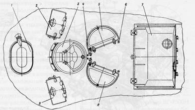 7 — крышка люка механика-водителя; 2 и 9 — крышки световых окон; 3 — командирская башенка; 4 — стопор; 5 и 8 — крышки люков десантников; 6 — упор; 7 — крышка кормового люка.