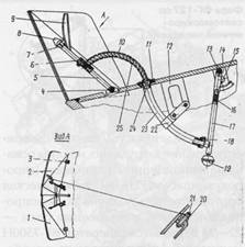 1 — левый лист; 2 — правый лист; 3 — петля; 4 — ось рамки; 5 — рамка (подвижная); 6, 11 и 18 — уплотнения; 7 — головка рычага; 8 — упор; 9 — направляющая; 10 — трос; 12 — кронштейн; 13 — ось рычага; 14 — сектор; 15 — стопор рычага; 16 — пружина; 77-рычаг; 19 — рукоятка; 20 — пружина поджимная; 21 — ось направляющей; 22 — хомут; 23 и 24 — трубки; 25 — втулка.