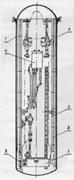 1 — пусковой стол с амортизацией; 2 — направляющие; 3 — средние опоры с амортизацией; 4 — верхняя опора с амортизацией; 5 — механизм заштыривания; 6 — механизм расстыковки и удержания электро- и пневморазъемов; 7 — шахта.