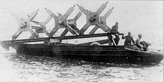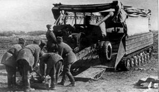 Загрузка орудия в транспортер К-61, оснащенный штормовым оборудованием.