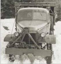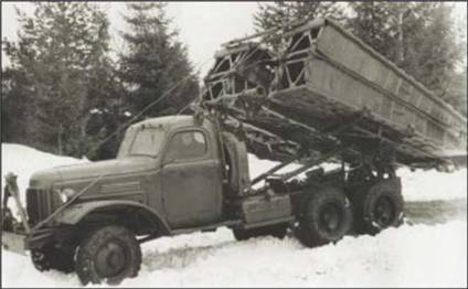 На косогорах пролетное строение укладывалось на рвы шириной до 6 м с поперечным креном местности до 7°. При развертывании пролетного строения, в момент его самостоятельного выпрямления, наблюдалось перемещение колей по опорной трубе рычагов в сторону крена до упора колесного настила в раму автомашины. В результате, при опускании пролетного строения на препятствие, колесный настил деформировался. При взятии пролетного строения происходило аналогичное явление и, как следствие, колеи смещались относительно кареток рычагов. Это затрудняло перевод колей в транспортное положение. Одновременно было установлено, что предварительным смещением колей в сторону, противоположную крену, несовпадения колей и кареток можно избежать.