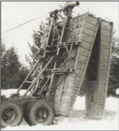 Возможность взятия пролетного строения путем предварительного подъема до вертикального положения с последующим его складыванием проверялась на примере моста, уложенного на ров шириной 6,5 м. Однако в момент складывания колей с помощью лебедки произошло их самопроизвольное складывание. Возникшие усилия динамического характера вызвали обрыв цепей поперечной балки, прогиб опорной трубы рычагов, обрыв малых цепей, удерживающих нижние половины колей, и сдвиг удлинителя лонжеронов рамы автомашины. Пролетное строение рухнуло в ров.