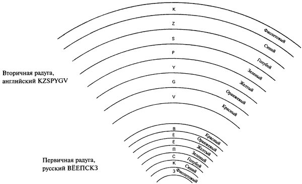 Вспомним, что Набоков был не только писателем, но и довольно известным ученым. Его интерес к природе и тонкая наблюдательность очевидны в его произведениях. Именно в этой области нам надо искать объяснения зеркально отраженным радугам. В природе существуют два вида радуги — первичная и вторичная. Первичная радуга образуется, когда лучи преломляются при входе в каждую каплю, отражаются от ее внутренней поверхности и снова преломляются на выходе. Красный цвет в таком случае виден вверху дуги. Вторичная радуга располагается над первичной, является концентрической относительно нее; она несколько больше и бледнее. Красный цвет находится внизу дуги.{33} Акроним для русской «радуги» Набокова, ВЁЕПСКЗ (красный, оранжевый, желтый и т. д.) соответствует яркой первичной радуге, где красный цвет вверху, а английский акроним KZSPYGV соответствует более широкой и менее яркой вторичной радуге, где красный цвет (то есть V) — внизу. Расположение и соотношение зеркально отражающихся радуг проиллюстрировано прилагаемым рисунком.
