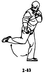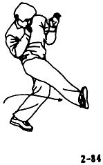 Описание движения: обнаружив, что находящийся сзади противник собирается атаковать вас в голову, перенесите центр тяжести тела вперед, уклоняясь от удара, одновременно опираясь на правую ногу, левой ногой нанесите резкий удар назад в пах противнику. Во время контратаки голову повернуть направо, смотреть назад.