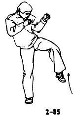В продолжение действий предыдущего этапа правую кисть вновь сожмите в кулак, руку оттяните назад, левая рука прикрывает подбородок. Одновременно центр тяжести тела перенесите вперед, поднимите правую ногу и нанесите мощный удар пяткой вперед на высоте паха.