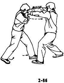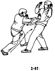 Практические действия: когда противник сгибает руки, чтобы защититься, вы правой ладонью быстро нанесите мощный удар ладонью в живот противнику и затем продолжайте контратаку другими приемами, (см.: рис. 2-87).