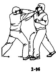 Продолжайте вашу контратаку. Раскройте пальцы правой руки, захватите ими противника и пригните его вниз до уровня живота. Разверните корпус влево на 90°, образуя стойку цибу. Одновременно кулаком правой руки нанесите резкий удар сверху вперед—вниз. Взгляд — на правый кулак. Практические действия: воспользуйтесь тем, что противник нагнулся вперед, закрывая живот, левой рукой захватите противника и пригните его вниз. Одновременно правым кулаком нанесите противнику удар сверху вниз по затылку, (см.: рис. 2-106).