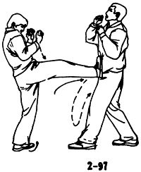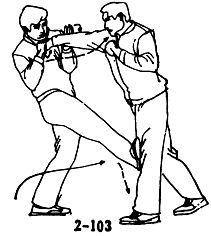 действия: противник атакует вас спереди в голову. Вы отклоняете верхнюю часть корпуса назад, уходя от удара. Левой рукой выполните защиту ладонью, поднимите правую ногу и нанесите ею удар вниз в колено или переднюю часть голени противника, (см.: рис. 2-103).Требования: защита ладонью и удар стопой должны быть хорошо скоординированы. Грудь «закрыта», живот втянут, движения быстрые и мощные, касания точны;